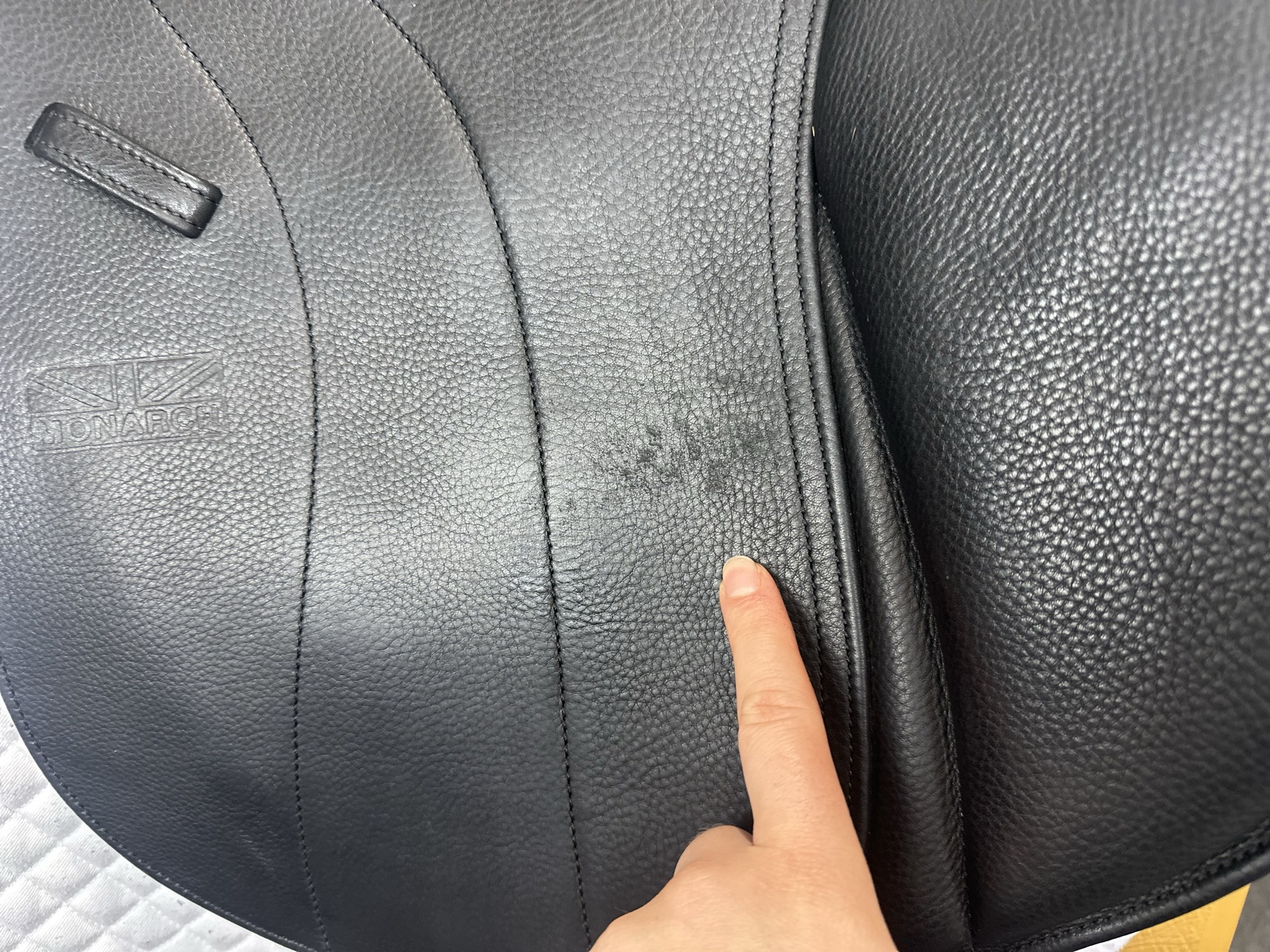 It is normal, especially if the surface of the leather is ‘damp‘, to experience some colour loss onto your breeches.