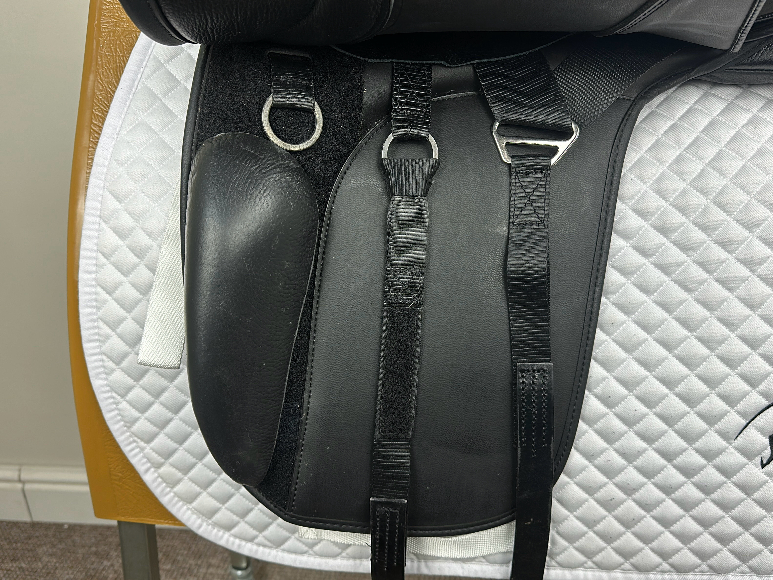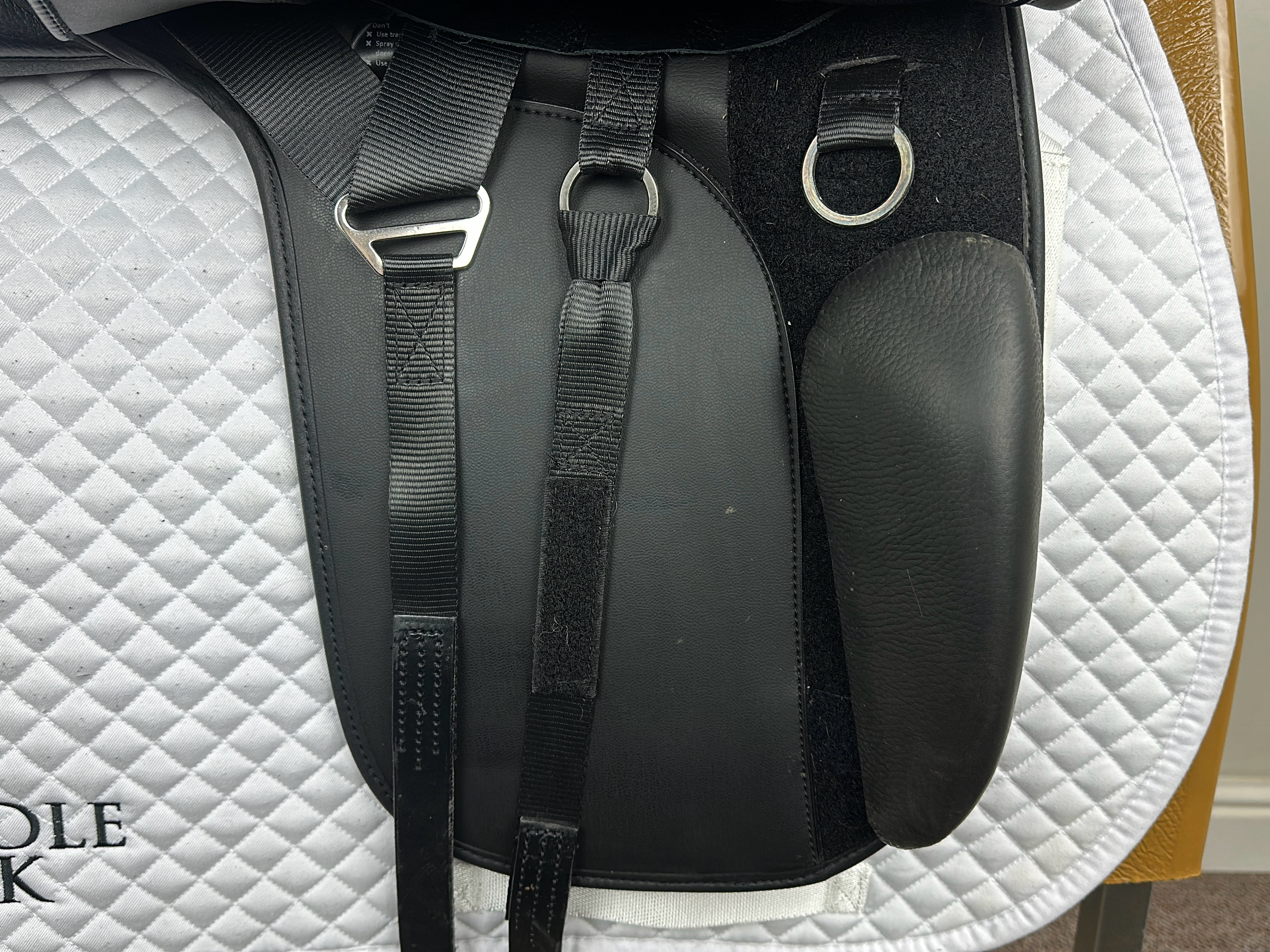 - Moveable velcro thigh block to help rider maintain a balanced dressage position.